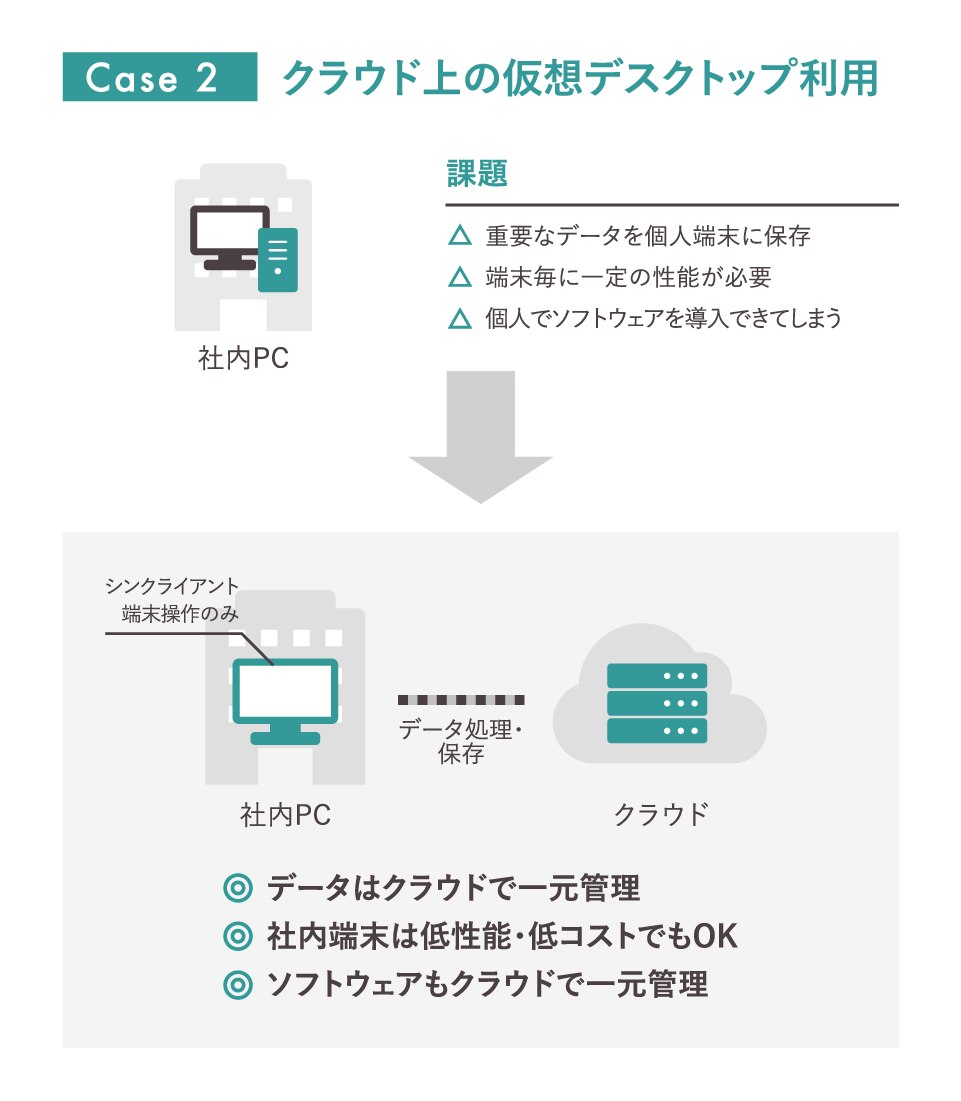 - クラウドの利用により、PCのメンテナンスや保守契約などの運用管理が不要となります。また、PCの定期的なリプレースも不要となります。