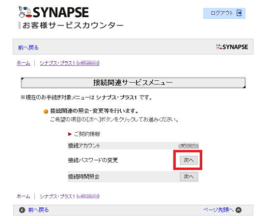 5. 「接続パスワード変更」の「次へ」をクリックします