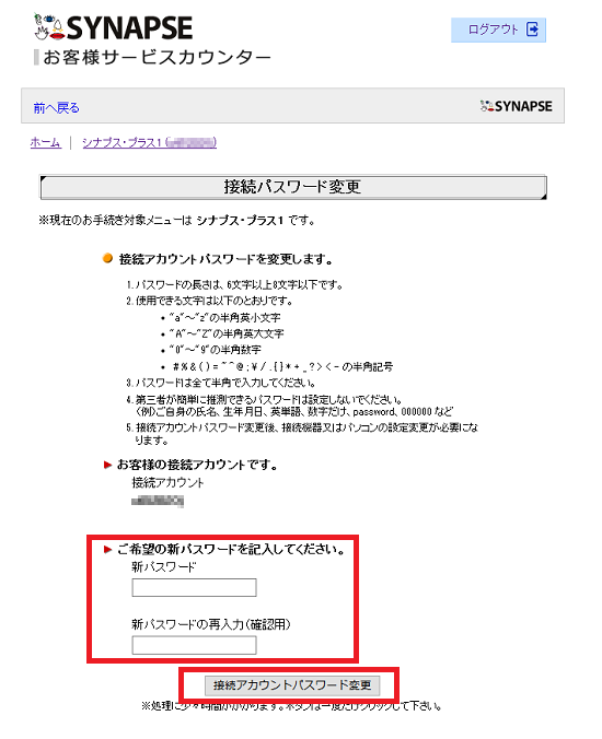 6. ご希望の新パスワードを入力し「接続アカウントパスワード変更」をクリックします